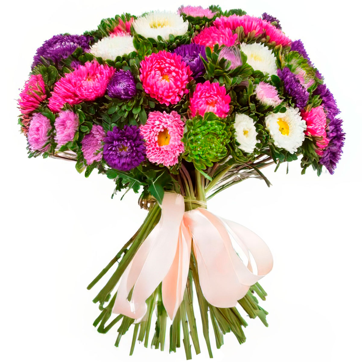 Астры фиолетовые, розовые, зеленые, белые, нежно-розовые.