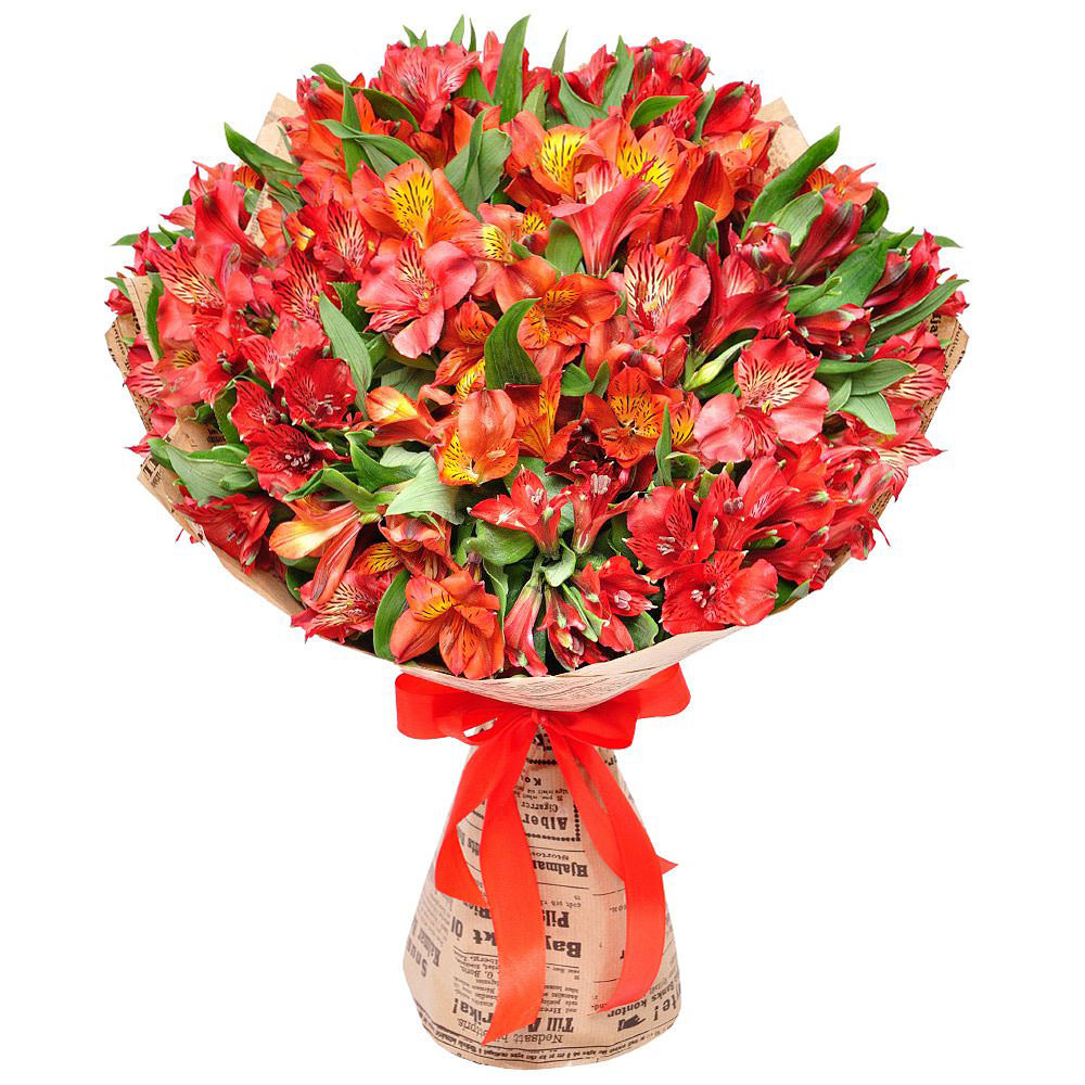 Альстромерия красная. Желаемый цвет можете запросить у менеджера! Упаковка (лента, пленка, крафт, сетка, пленка матовая)