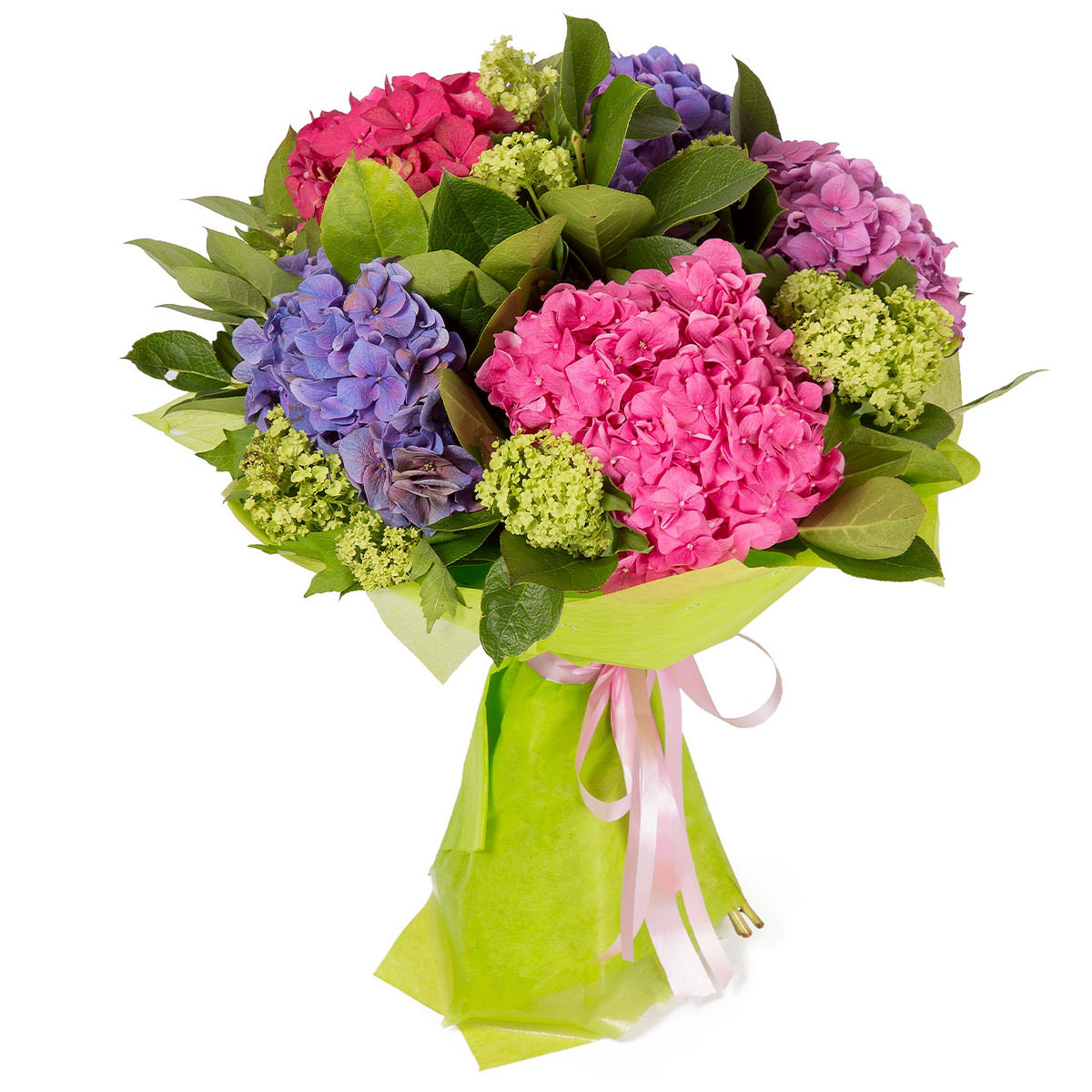Гортензия розовая, зеленая и фиолетовая. Упаковка (лента, пленка, крафт, сетка, пленка матовая)