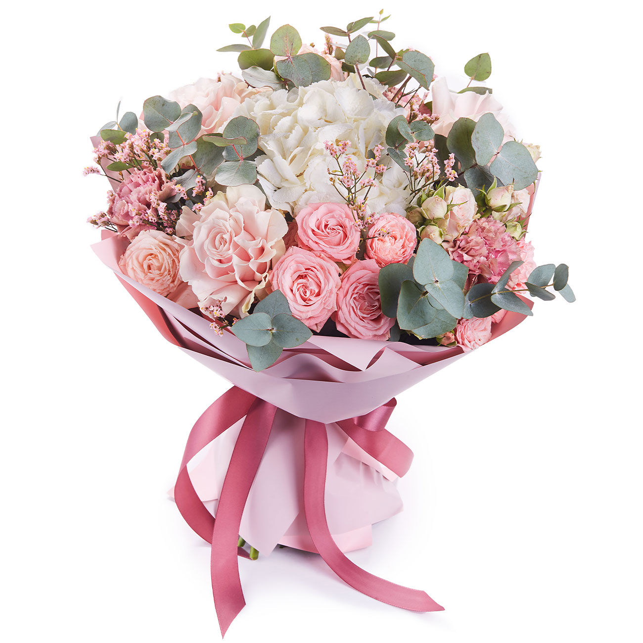 Роза кустовая розовая, роза одноголовая розовая, гортензия белая, гвоздика розовая, эвкалипт, статица. Упаковка (лента, пленка, крафт, сетка, пленка матовая)