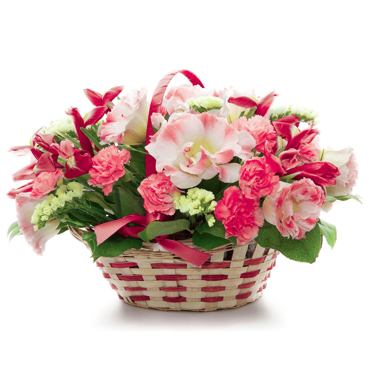 Эустома розовая, гвоздика кустовая мини розовая, ирис розовый, статица. Упаковка (Корзина, оазис, ящик).