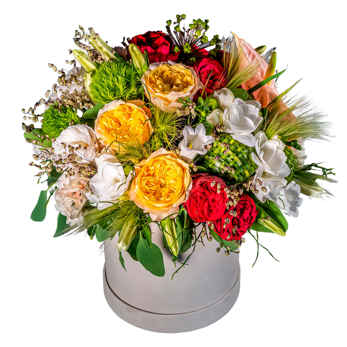 Роза пионовидная желтая и красная, фрезия белая, антуриум, сухоцветы, зелень. Упаковка (шляпная коробка, квадратный бокс, коробка сердце, оазис)
