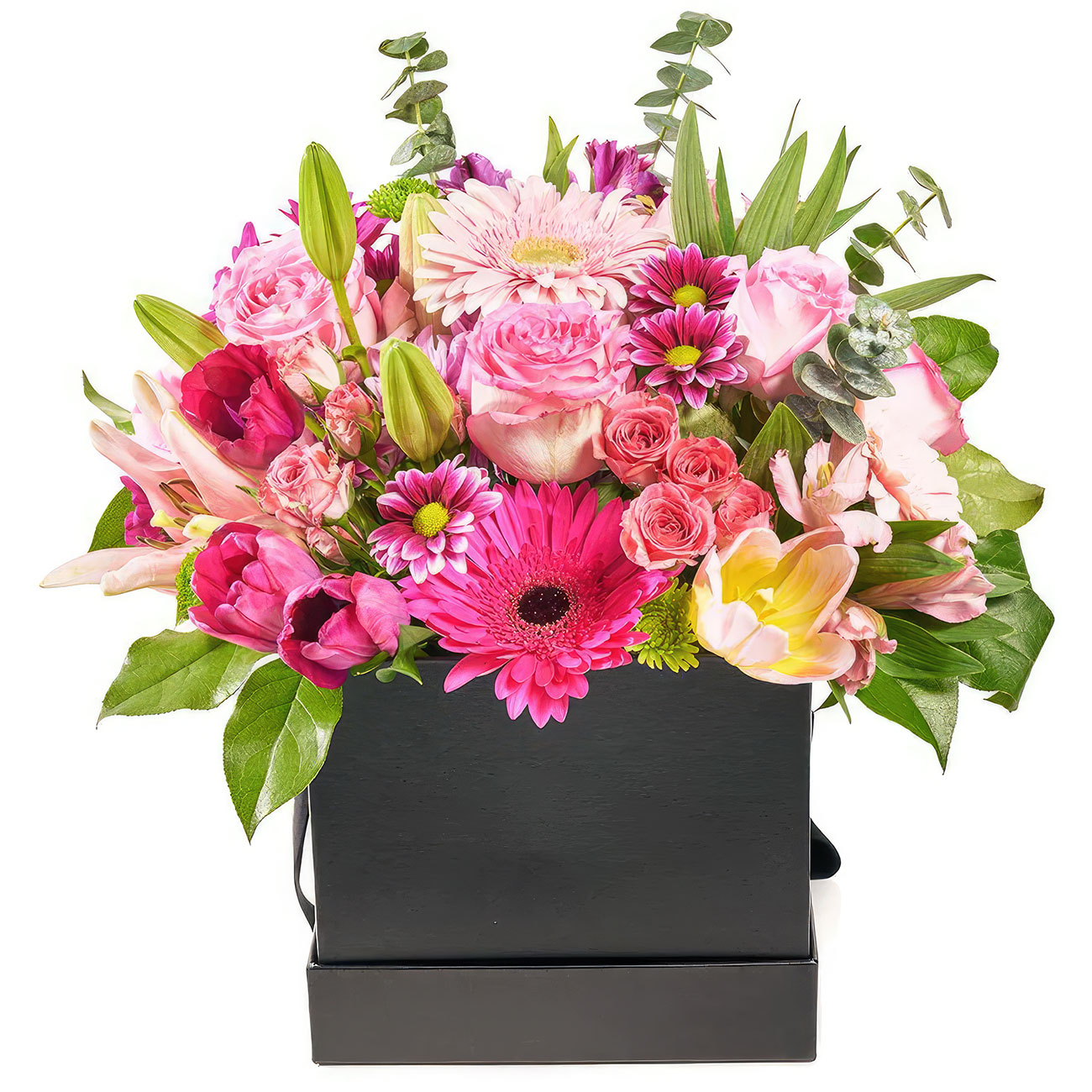Гербера розовая, тюльпан розовый, лилия розовая, хризантема кустовая сиреневая и зеленая, роза кустовая розовая, роза одноголовая розовая, альстромерия розовая, эвкалипт, зелень. Упаковка (шляпная коробка, квадратный бокс, коробка сердце, оазис)