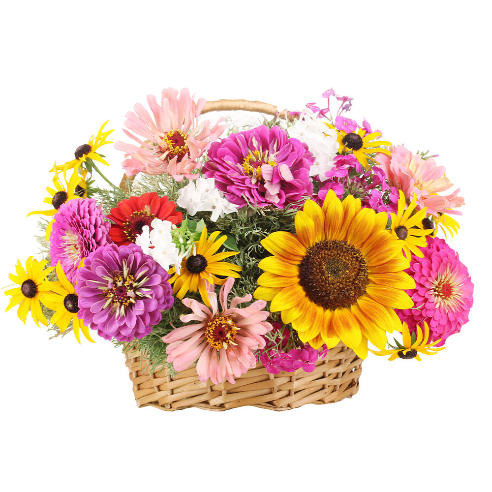 Циния лунный камень, подсолнух, астра микс (оттенки розового), флокс белый, гербера красная, зелень. Упаковка (Корзина, оазис).